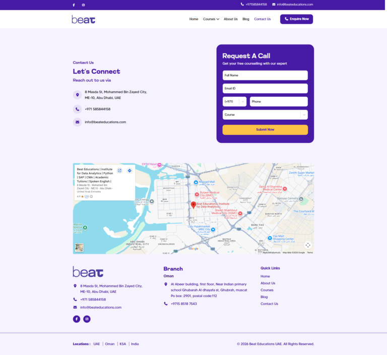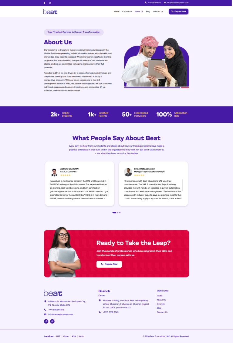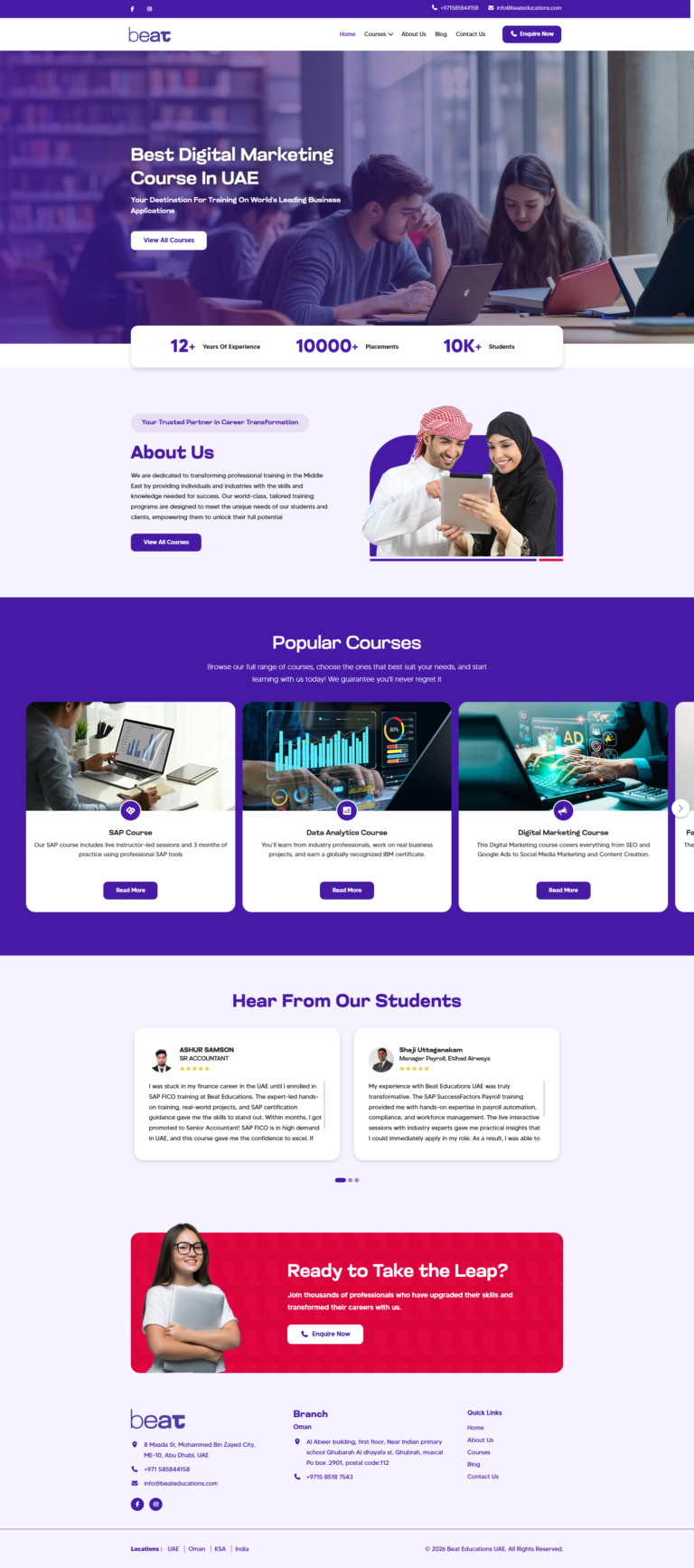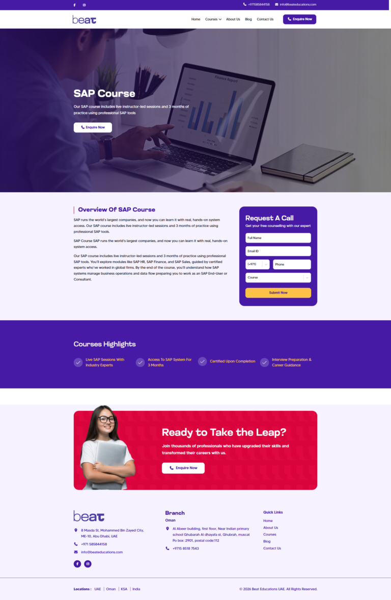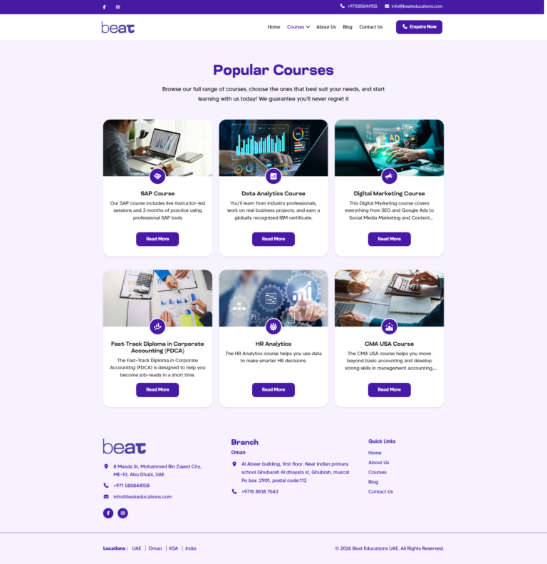 Our website design for BEAT Educations UAE was developed to deliver a modern, user-friendly, and engaging digital experience for learners. With a clean layout, structured course sections, and intuitive navigation, the website allows users to easily explore programs such as SAP, Data Analytics, Digital Marketing, and other professional training courses.