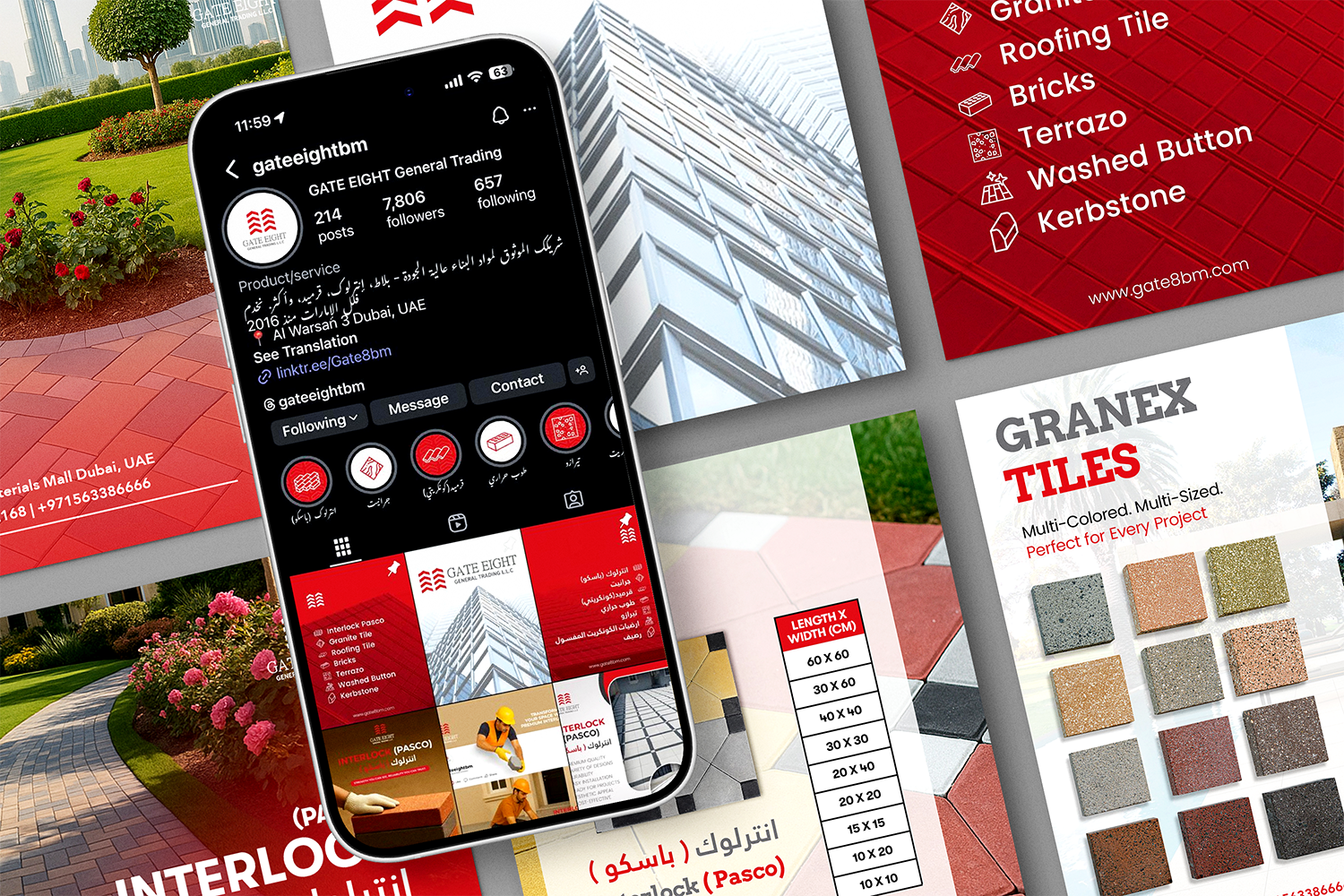 Our social media designs for Gate Eight General Trading LLC showcased their premium range of interlocks, tiles, kerbstones, and building materials. With bold visuals and strong messaging, each post emphasized the brand’s quality, durability, and commitment to building lasting foundations.
