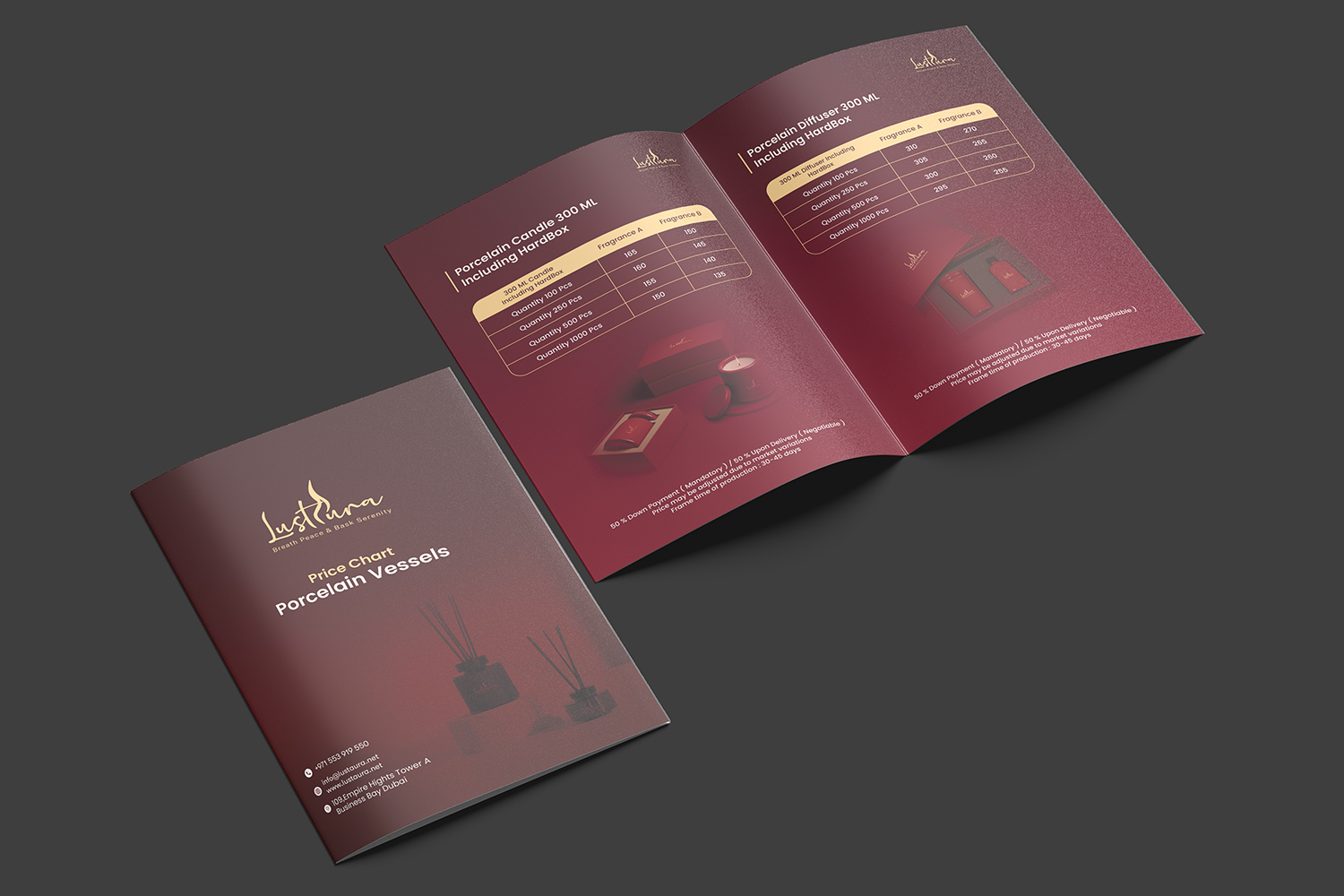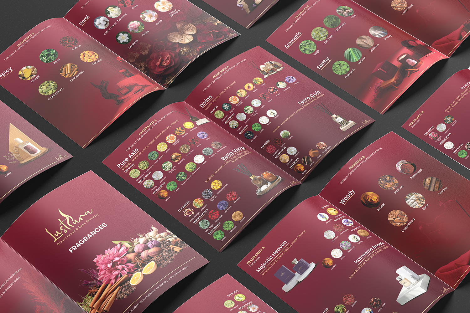 Our printing collaterals for Lustaura showcase a refined and luxurious product catalogue, highlighting an exquisite range of signature scents and fragrance collections. Designed with an elegant layout and rich visual aesthetics, the catalogue reflects the brand’s sophistication, quality, and timeless appeal.