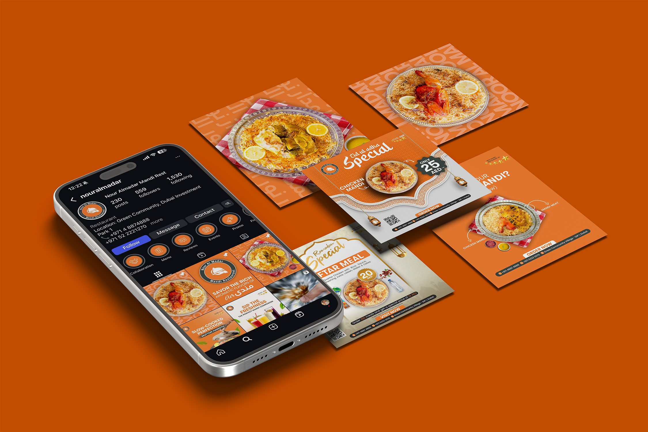 For Nour Al Madar Restaurant, our process focused on enhancing their online presence through Instagram and Facebook. We created engaging food visuals, reels, and promotional posts that showcased their authentic Arabic and Mandi dishes — building a strong connection with audiences and driving more dine-in and delivery engagement.