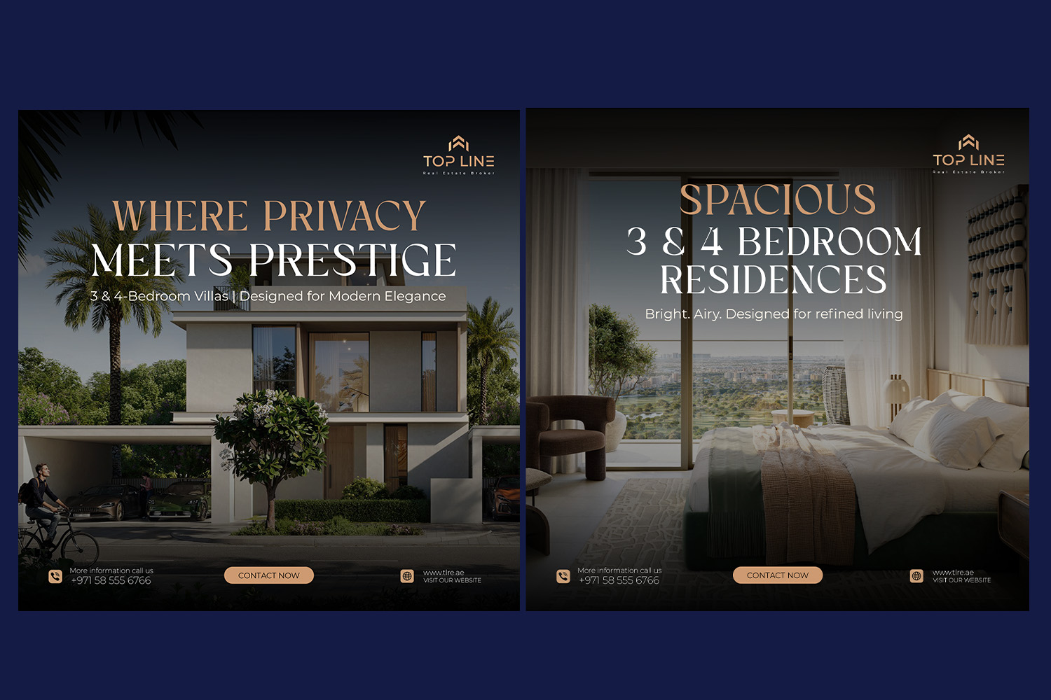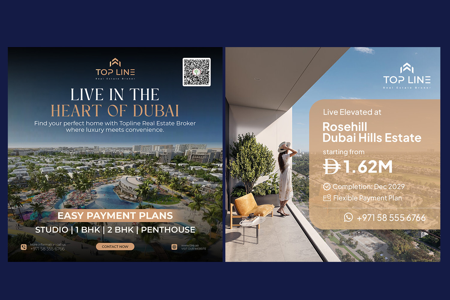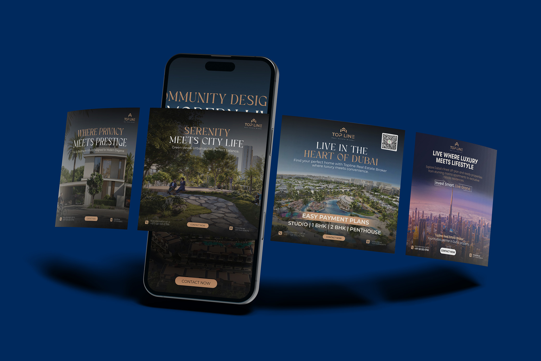 Our social media designs for Topline Real Estate were crafted to highlight premium properties and lifestyle experiences across Dubai. Each post combined elegant visuals with compelling content, enhancing the brand’s digital presence and engaging potential buyers with a touch of sophistication.